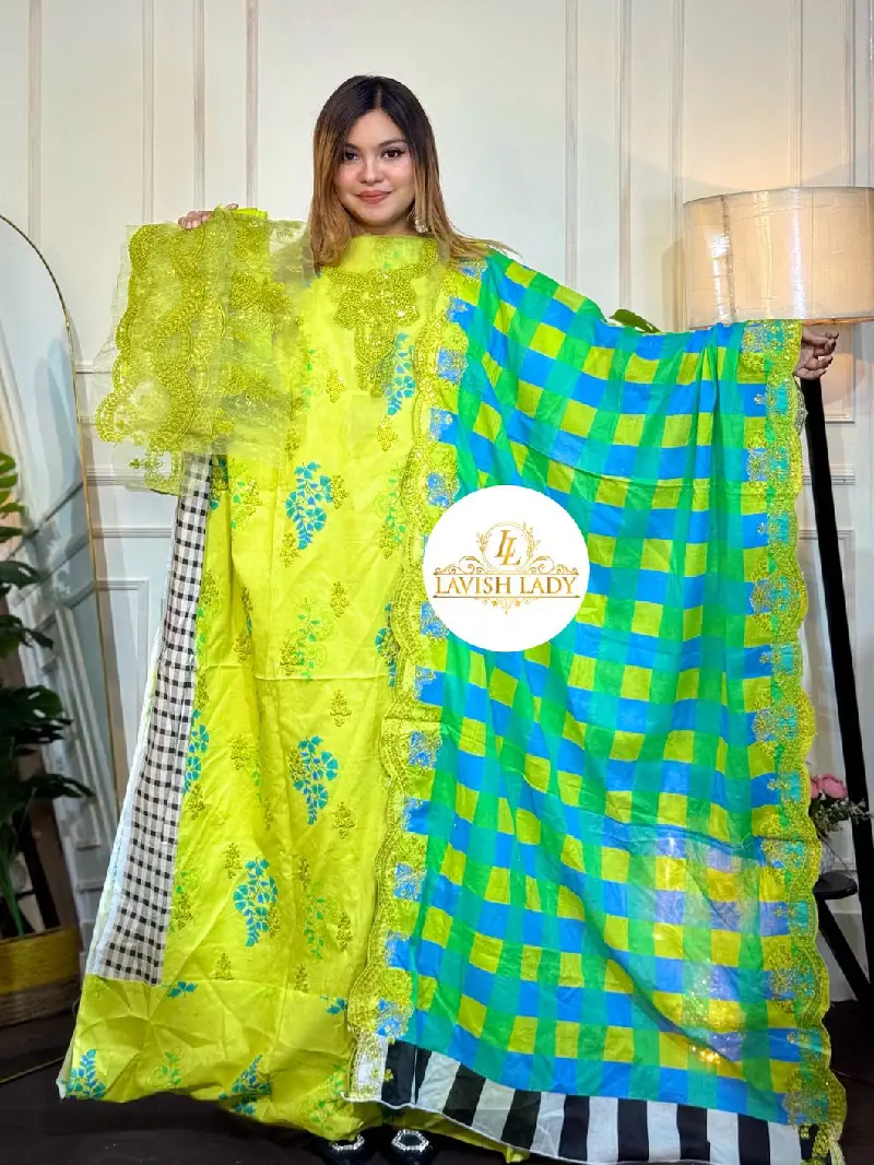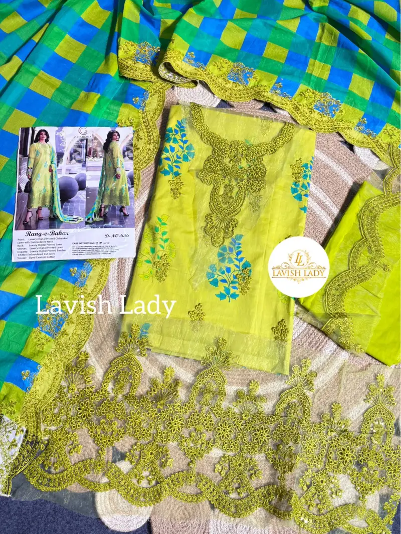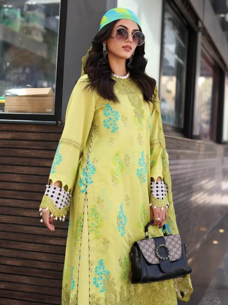 এই ড্রেসটি লাইম গ্রিনের সাথে নীল রঙের ডিজিটাল প্রিন্টের ফ্লোরাল কাজ রয়েছে। জামার পুরো ফ্রন্ট পার্টে ছিটানো কাজ, দামানে বোরিং এম্ব্রইডারি পাচ্ছেন। তাছাড়া ডেসের নেক পার্ট, স্লিভস, দামান এবং প্যান্ট এর জন্য এক্সক্লুসিভ সিকোয়েন্স এমব্রইডারিড লেস/প্যাচ থাকবে।