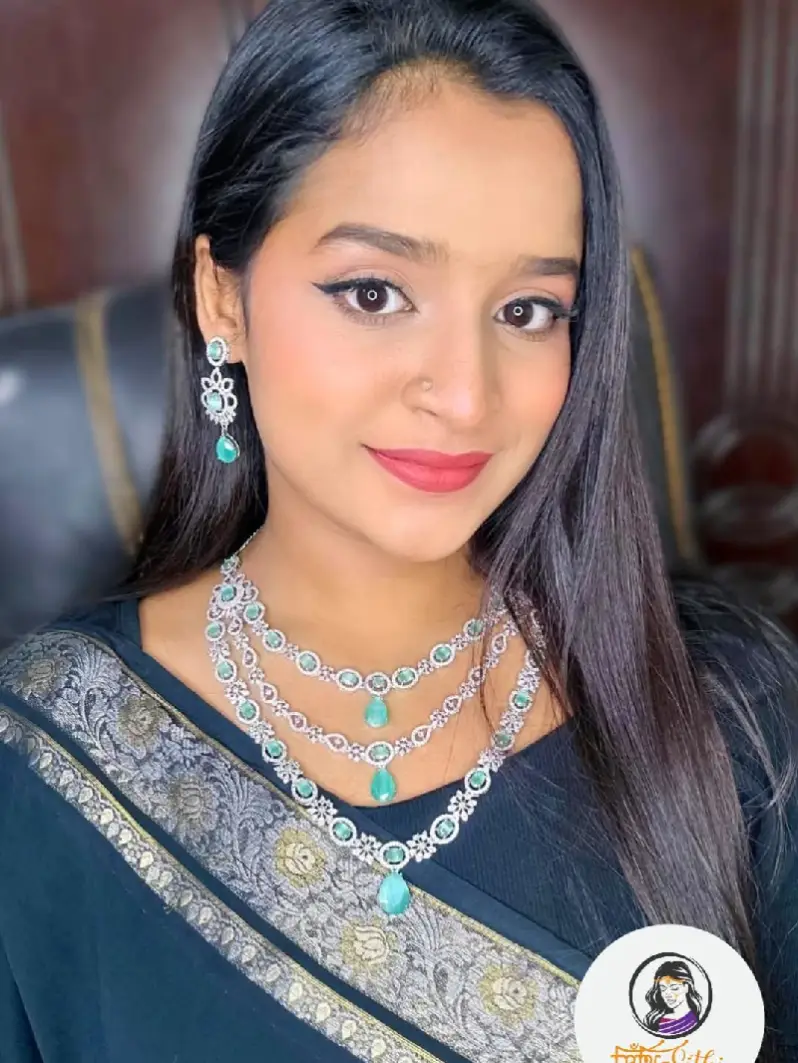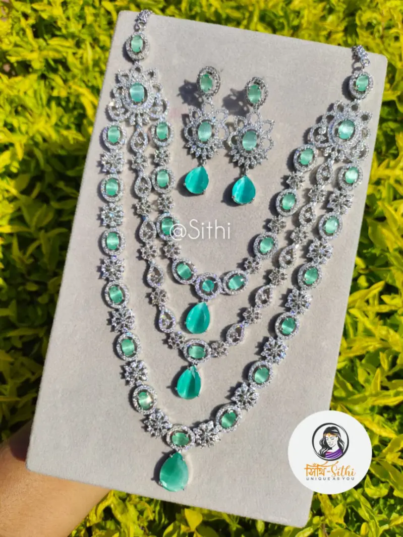 This Jewelry Set Is A Multilayered American Diamond (AD) Necklace Set With Mint Green Stones A Popular Style In Indian And Pakistani Fashion Jewelry.